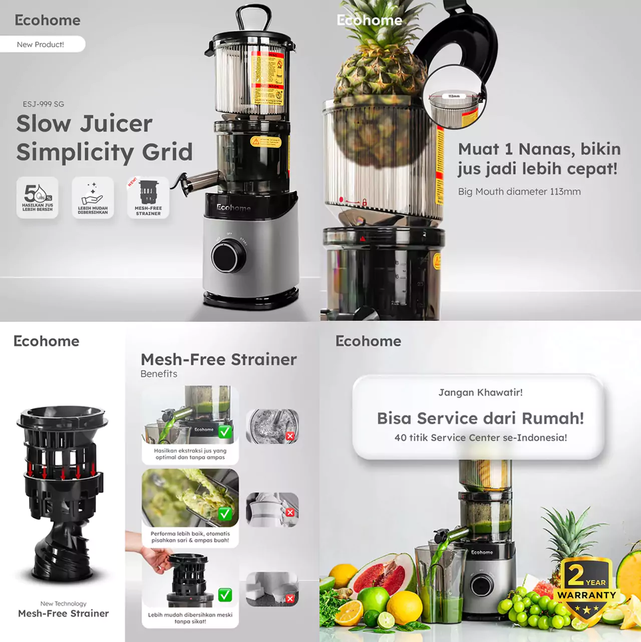 Slow Juicer Big Mouth Ecohome ESJ999SG memiliki feeder tuber berdiameter 113 mm yang diklaim dapat dimasukan 1 buah nanas utuh tanpa dipotong terlebih dahulu. Dibanderol di harga Rp 1.958.000, telah terjual di official store marketplace Shopee sebanyak 657 Pcs dengan rating produk 4.8/5.